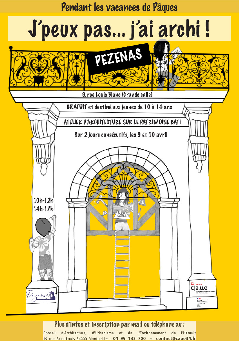 Pour les vacances de Printemps, l’atelier aura lieu a Pézenas, sur 2 jours consécutifs, mardi 9 et mercredi 10 avril 2024, de 10h à 12h et de 14h à 17h. Il portera sur le patrimoine bâti.