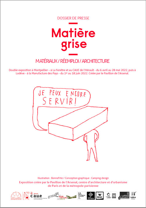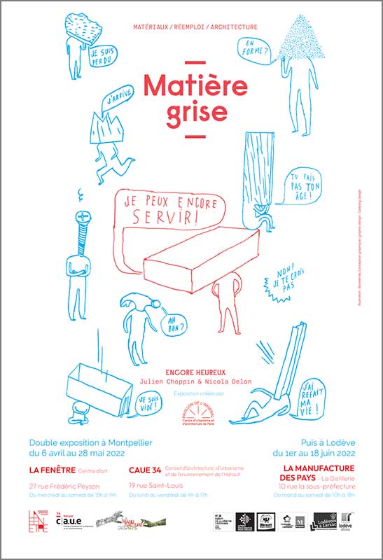 L’exposition « Matière grise – Matériaux / Réemploi / Architecture » – réalisée par le Pavillon de l’Arsenal – sera exposée à Montpellier du 6 avril au 28 mai 2022, simultanément au Centre d’art La Fenêtre et au CAUE de l’Hérault. Elle migrera ensuite à Lodève, du 1er au 18 juin 2022, où elle sera présentée à La Manufacture des Pays, au sein du Tiers-Lieu connu sous le nom de La Distillerie. Plusieurs événements l’accompagnent : conférences, visites, ateliers…