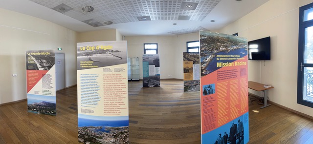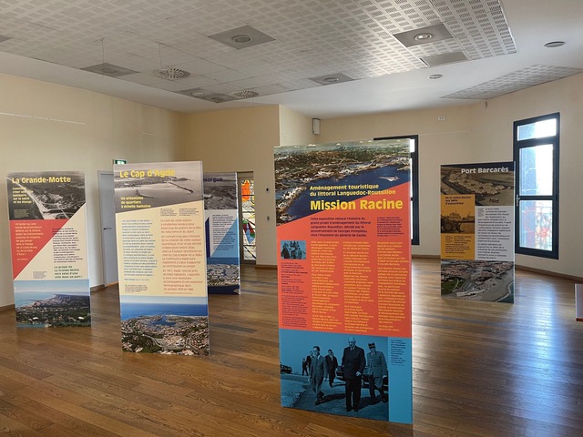 L’exposition est constituée de 6 triptyques : 1 présentation générale de la Mission Racine, 2 pour l’Hérault (La Grande-Motte, le Cap d’Agde), 1 pour le Gard (Port Camargue), 1 pour l’Aude (Port Leucate) et 1 pour les Pyrénées-Orientales (Port Barcarès).