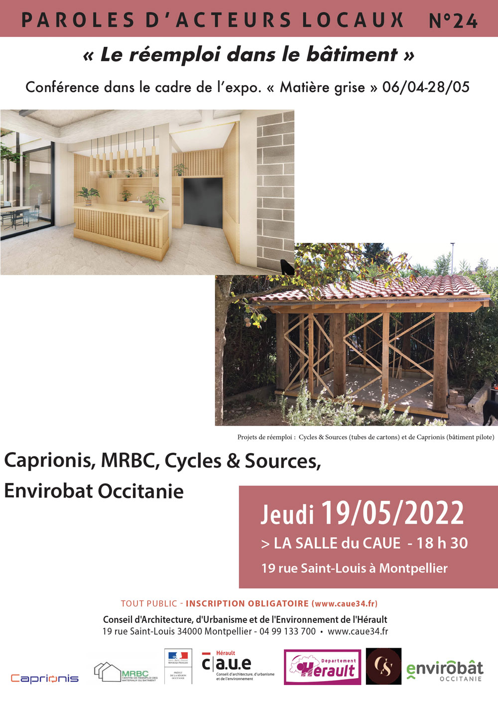 En accompagnement de l’exposition “Matière grise : Matériaux / Réemploi / Architecture” exposée à Montpellier, simultanément au Centre d’art La Fenêtre et au CAUE de l’Hérault, du 6 avril au 28 mai 2022, et après la conférence d’Isabelle BARDY, baubiologue, le CAUE 34 vous invite à une table ronde :