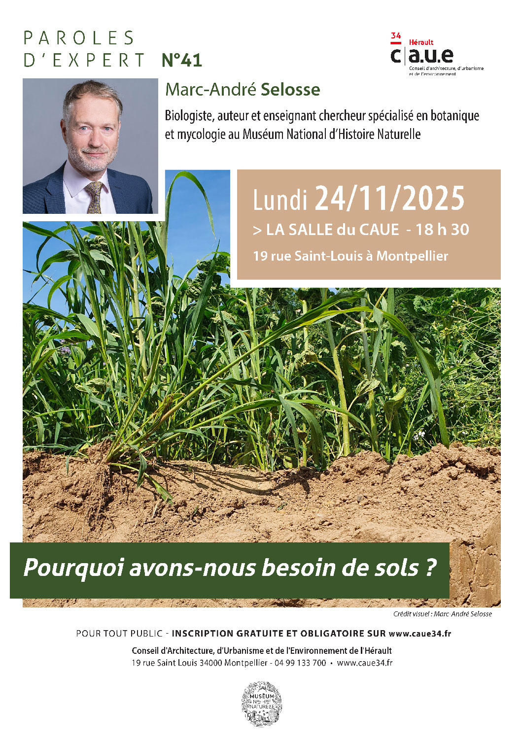 Pour cette conférence « Paroles d’expert », le CAUE34 accueille Marc-André Selosse, biologiste et spécialiste reconnu du monde vivant, qui viendra nous parler de la nécessité de préserver les sols. Car si la sobriété foncière se concentre souvent sur les questions de bâti et d’urbanisation, elle oublie parfois l’essentiel : ce qui se joue sous nos pieds.