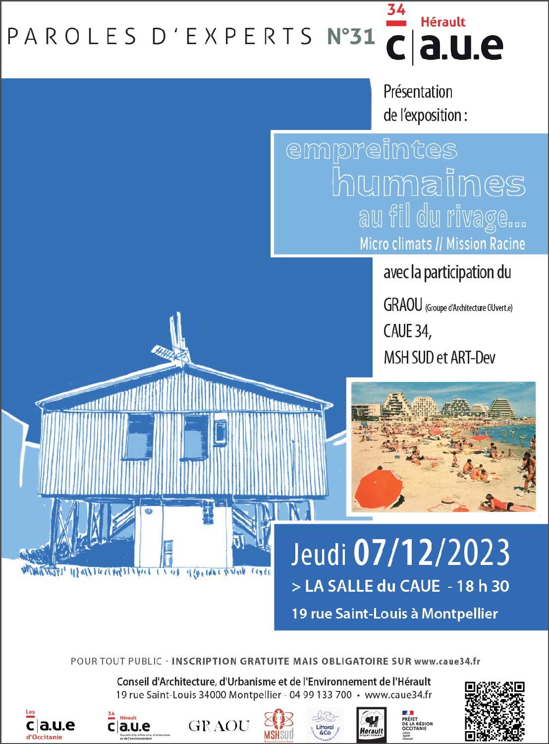 Afin d’inaugurer la double exposition “Empreintes humaines” au fil du rivage…, présentée au CAUE de l’Hérault du mardi 5 décembre 2023 au vendredi 9 février 2024, le CAUE de l’Hérault – en partenariat avec la Maison des Sciences de l’Homme SUD (MSH SUD) et le Groupe de Recherche en Architecture OUvert.e (GRAOU) – vous invite à la conférence :