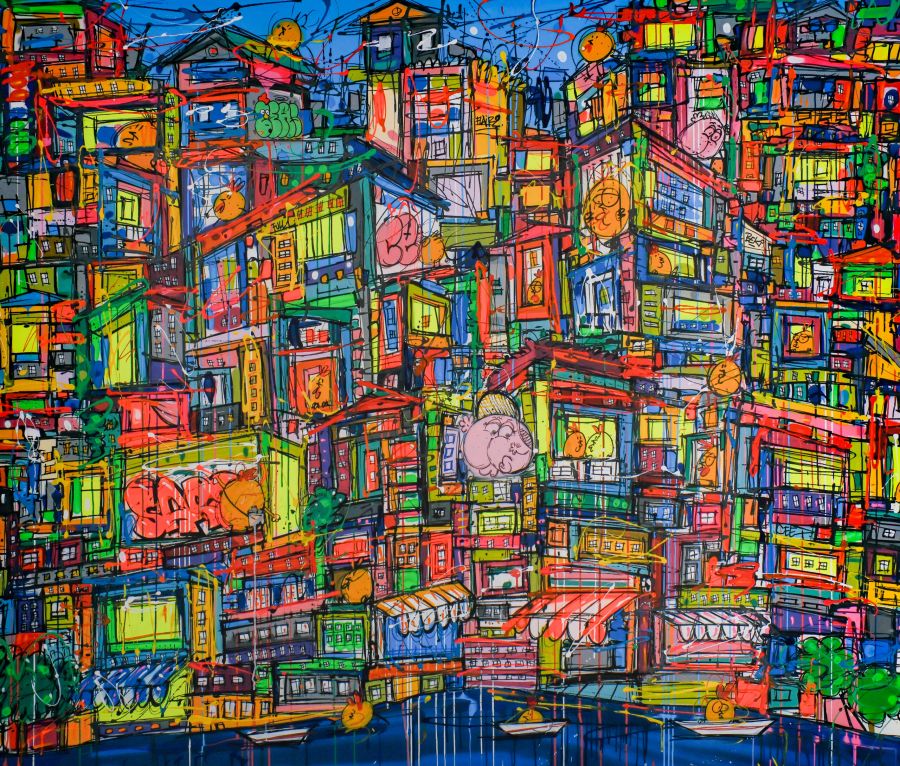 Avec FAVELAS, CEET Fouad déploie un univers urbain foisonnant, inspiré de ses voyages à Hong Kong, Manille, Medellín, l’île de La Réunion ou encore Toulouse. L’artiste s’empare des architectures denses et spontanées – ces empilements de constructions chaotiques, surpeuplées, bricolées, vivantes – que l’on associe aux bidonvilles asiatiques ou aux favelas sud-américaines.