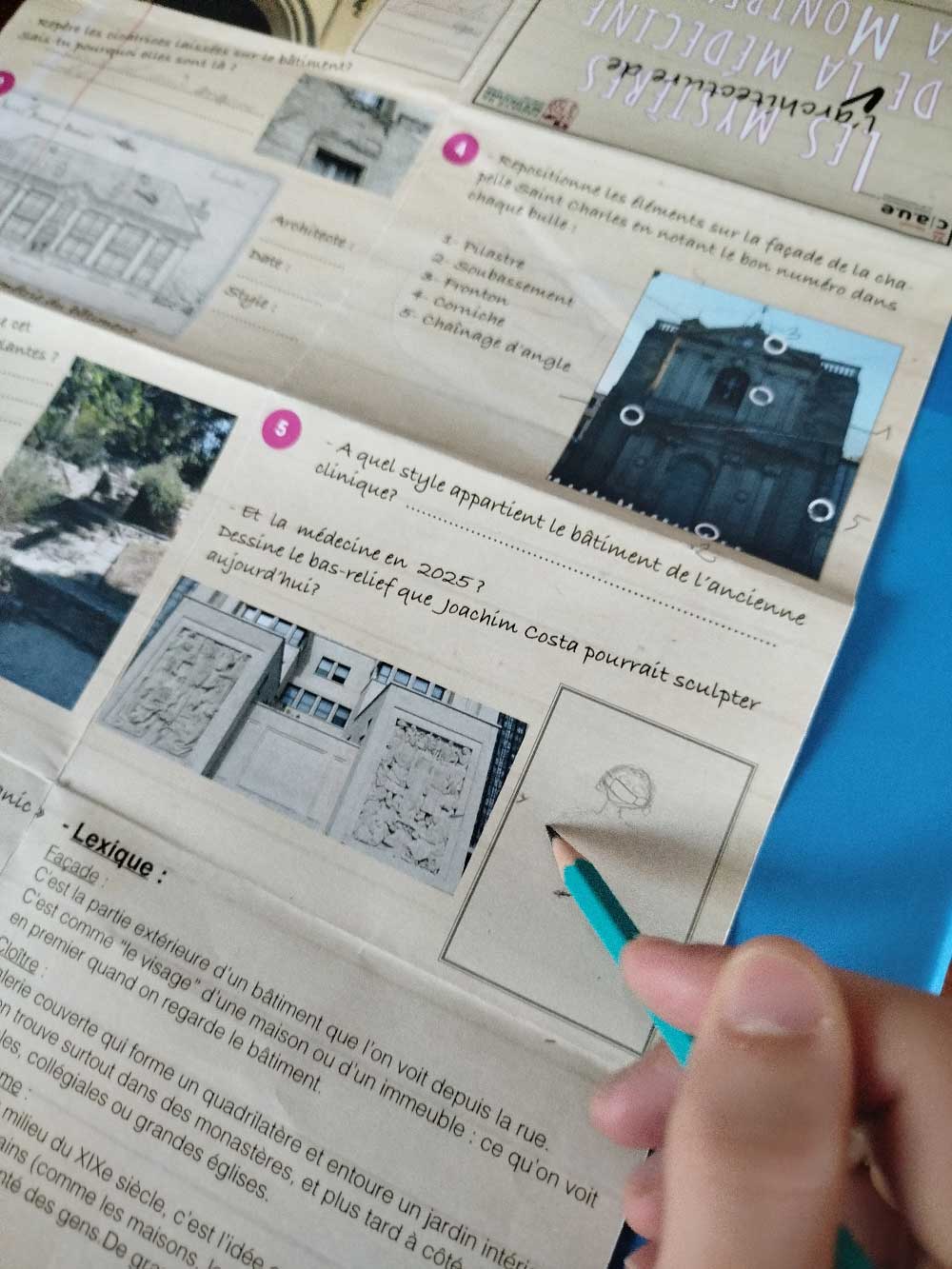 Tout au long du parcours, les élèves des écoles primaires Michel de l’hospital et Sigmund Freud ainsi que la Calandreta Dau Clapas étaient munis d’un support de visite illustré, conçu comme une véritable carte d’exploration. À travers des questions d’observation, des devinettes et des jeux de repérage architectural et botanique, ils ont appris à lire la ville autrement : décrypter les symboles, reconnaître les styles, identifier les plantes médicinales et relier chaque lieu à une époque de l’histoire de Montpellier. Ce carnet de parcours leur a permis de garder une trace concrète de la balade, tout en nourrissant leur curiosité.