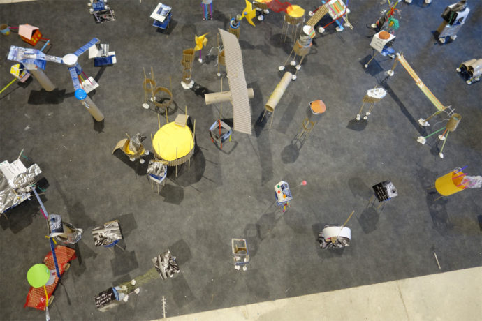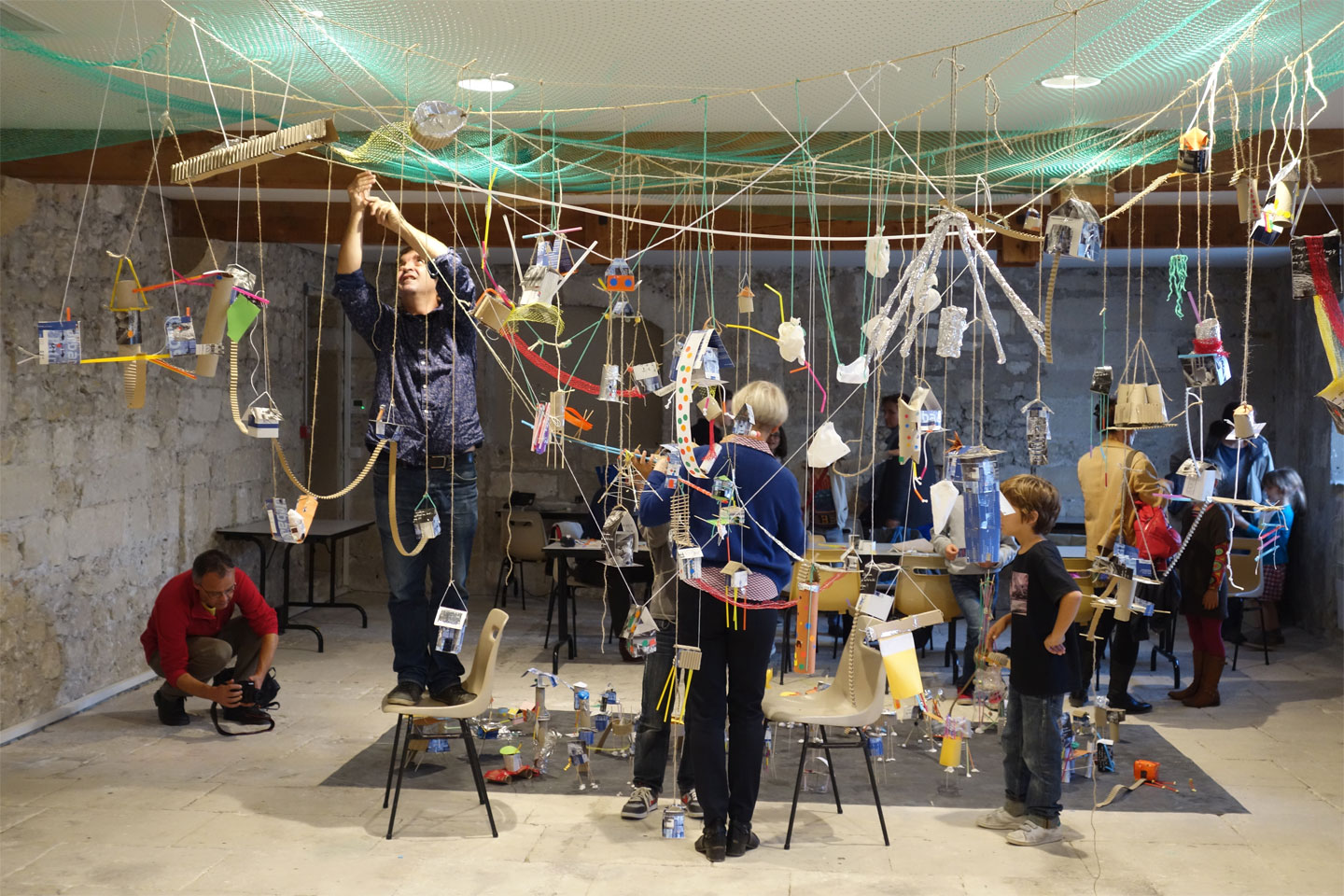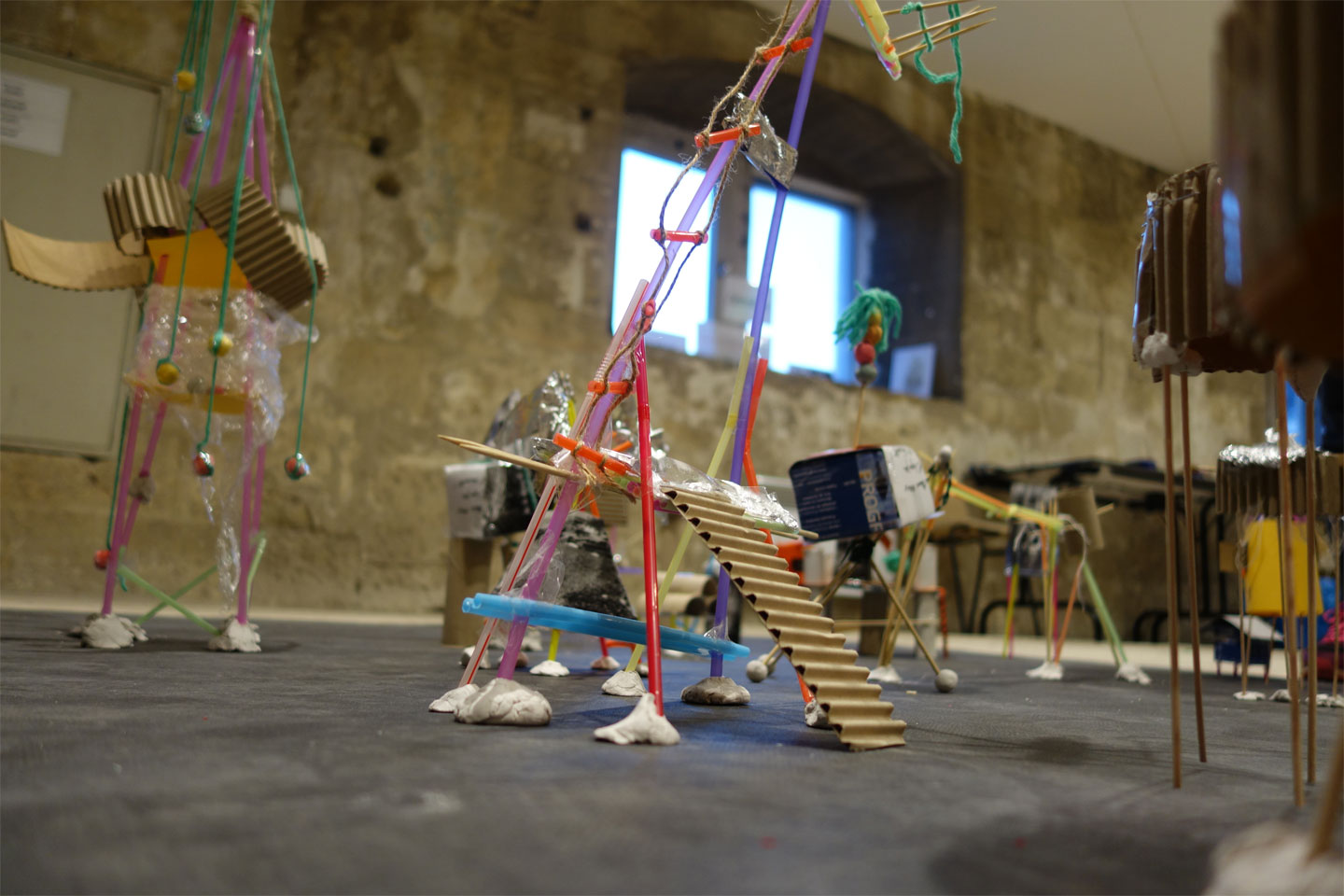 Les 120 participants (des élèves et leurs enseignants le vendredi, des enfants et leurs parents le samedi) ont réalisé en maquette deux des villes évoquées par Marco Polo et l’empereur Kublai Khan dans un dialogue imaginaire extrait de l’ouvrage d’Italo Calvino Les villes invisibles. Cet atelier a été précédé d’une lecture, par Alexia Vidal, comédienne, des textes décrivant les deux villes choisies : Octavie, la ville toile d’araignée et Zénobie, la ville sur pilotis.
