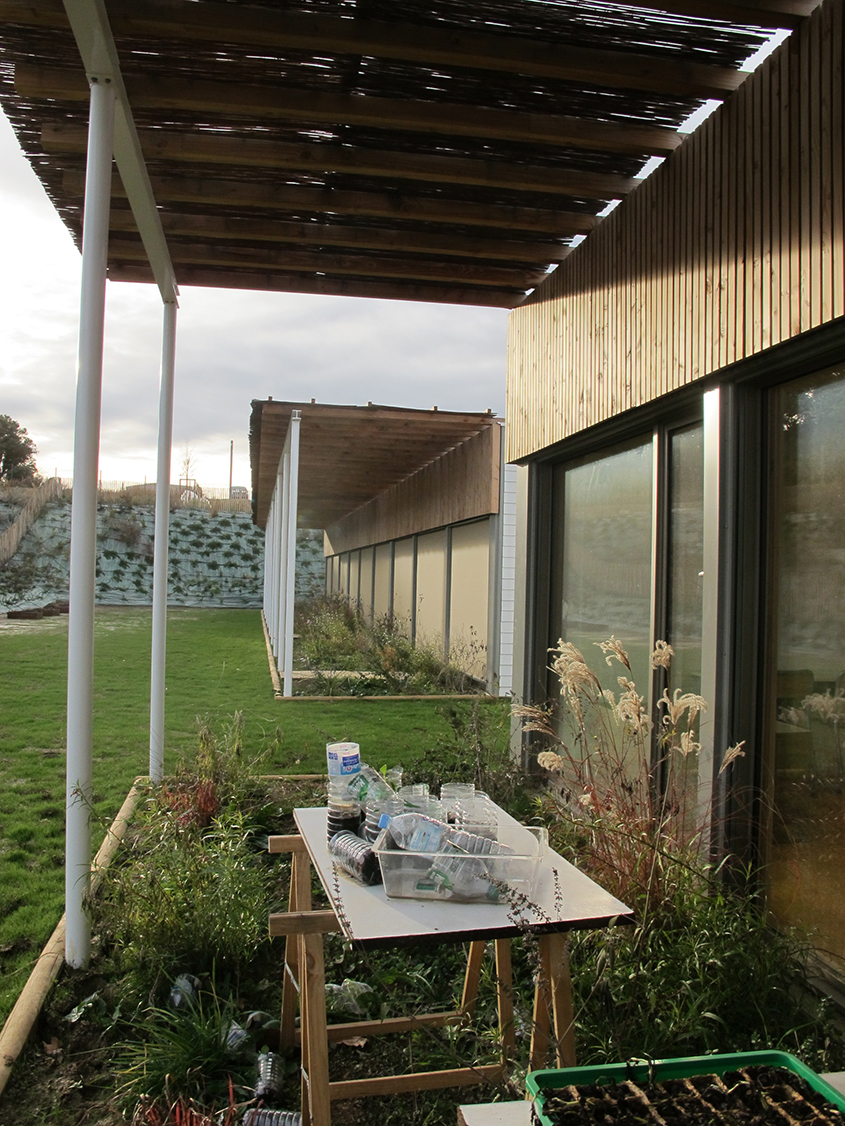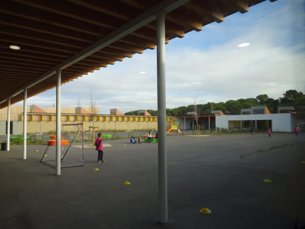 La faible hauteur des modules (contrainte par la préfabrication et le transport) permet d’avoir, depuis la cour, des vues sur le paysage proche et la cime des pinèdes avoisinantes.
