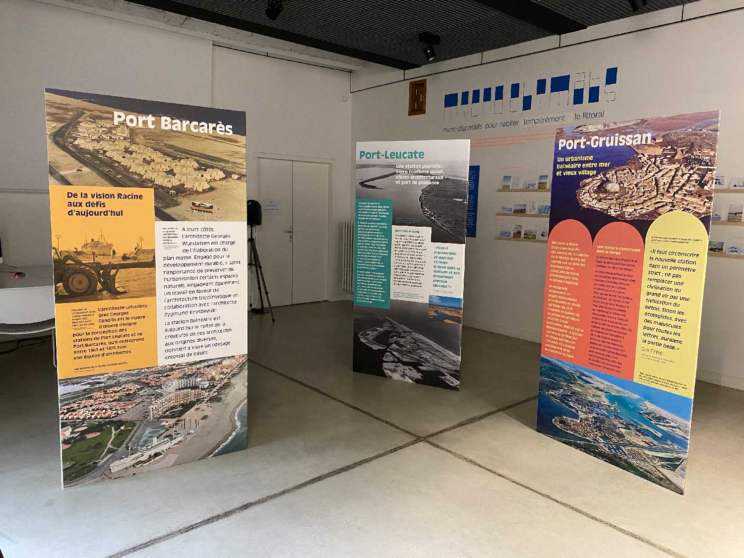 L’exposition comporte 28 panneaux : 3 panneaux de présentation générale de la Mission Racine et 3 panneaux pour les 7 stations touristiques : La Grande-Motte et le Cap d’Agde (Hérault), Port Camargue (Gard), Gruissan et Port Leucate (Aude), Port Barcarès et Saint-Cyprien (Pyrénées-Orientales).