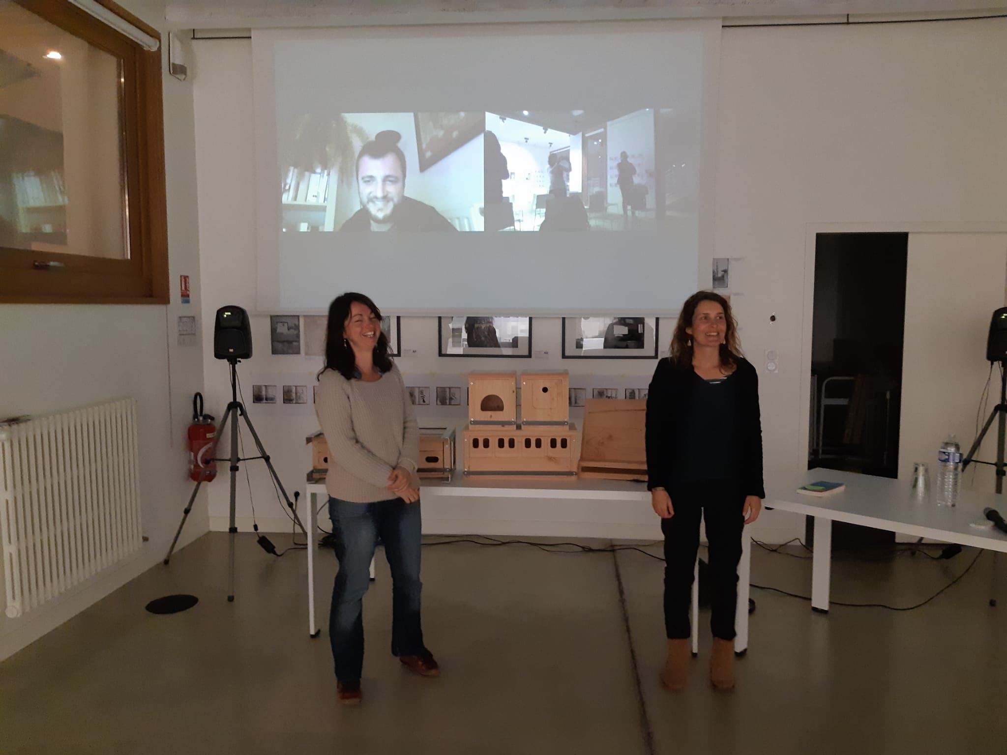 - En visio, Marc BARRA (Agence Régionale pour la Biodiversité en Île-de-France) et au premier plan de g. à d. : Blandine CARRÉ (Groupe Chiroptères L-R) et Lucie YRLES (COHAB).