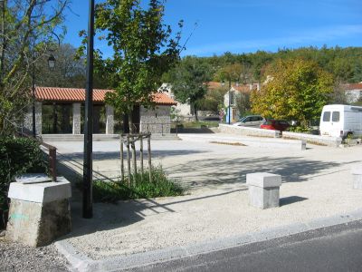 Pour réaliser la place, il aura fallu combler un ancien réservoir d’eau inutilisé. Aujourd’hui, une place publique, vaste parvis de plain-pied, située devant l’église, valorise l’entrée du village. L’espace est composé et ordonné. Une belle construction en pierre, disposée en fond de scène, abrite un préau, le local du comité des fêtes, un WC public et le local technique communal semi-enterré. Des murets et des bornes délimitent l’espace par rapport à la voie, tout en palliant le léger dénivellé du sol. La croix implantée initialement sur le bitume, en plein carrefour, y trouve également refuge. Deux arbres ponctuent l’entrée principale tout en qualifiant la façade de l’église juste en face.