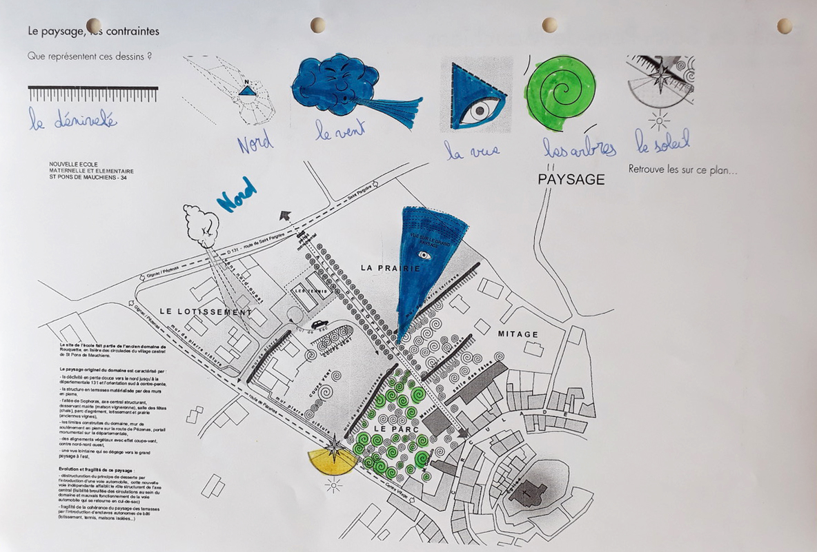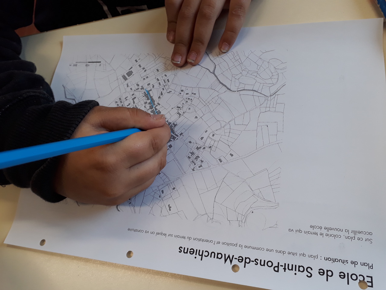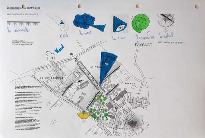 Depuis le mois de novembre 2017, le CAUE 34 intervient dans cette école pour une approche, avec les enfants de CE2, CM1 et CM2 de la classe de Bernard Lefèvre, du territoire communal et de ses caractéristiques, et de l’architecture de la future école.