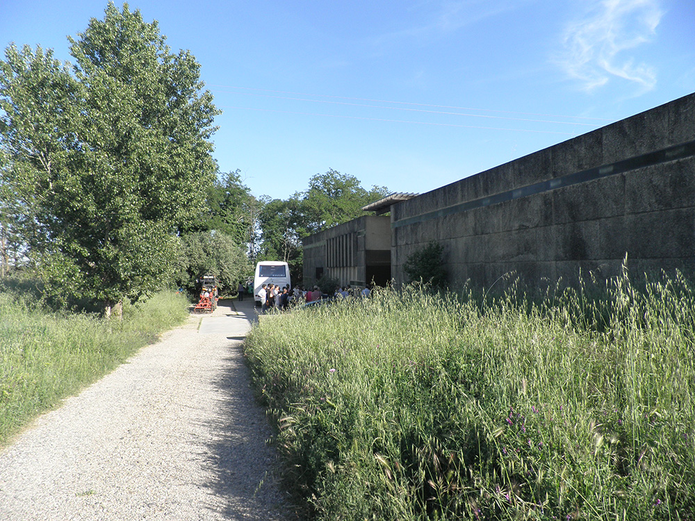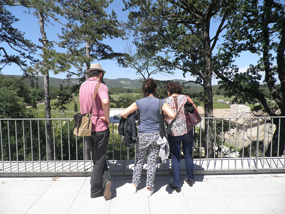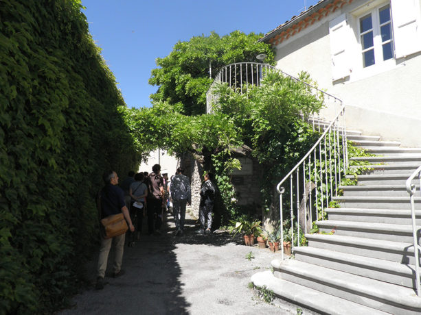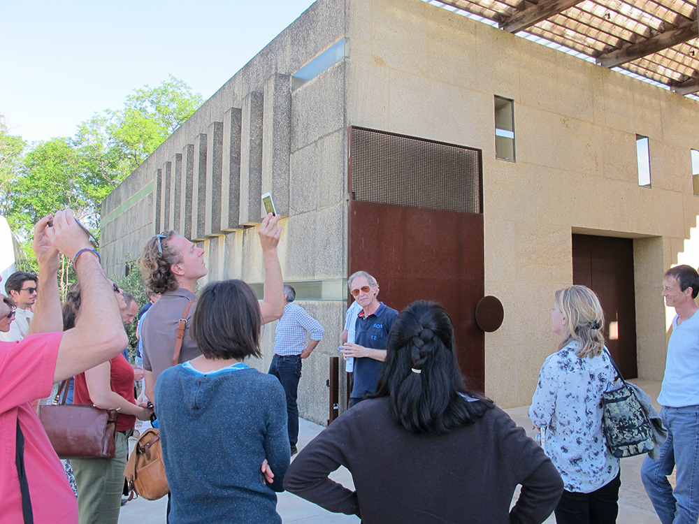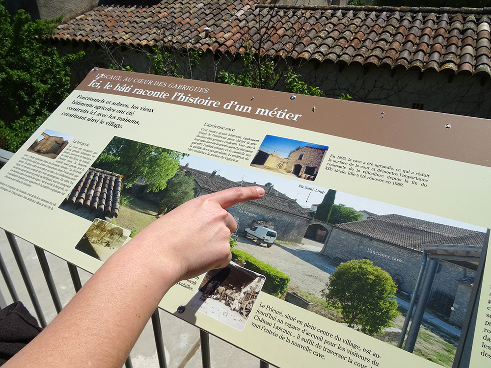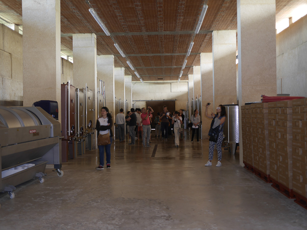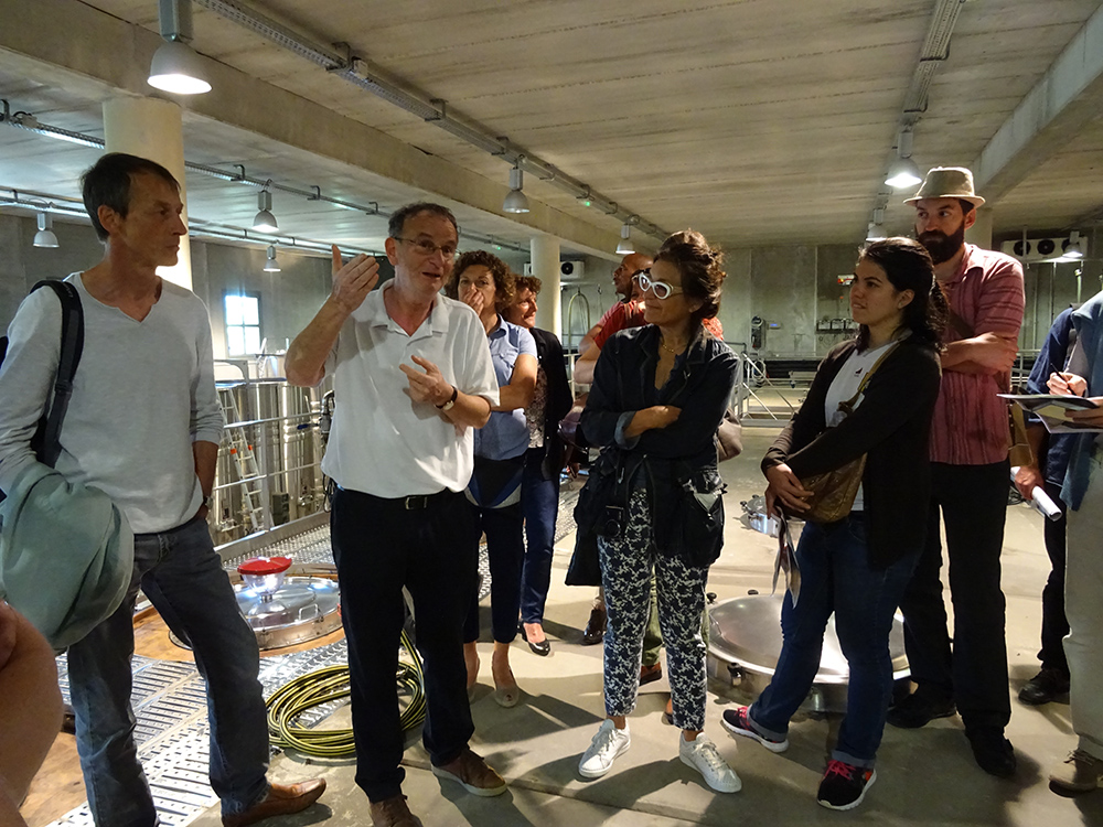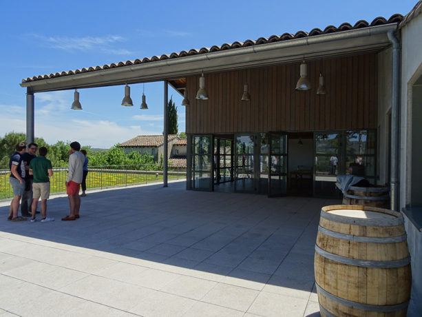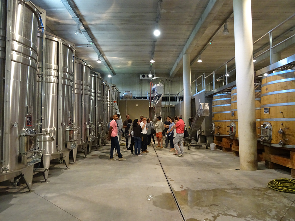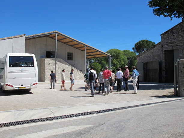 Vers 17 h, le groupe arrive à Nizas. Basile Saint Germain, propriétaire du domaine Les Aurelles, stoppe tout net le bus à l’entrée de la cave, située en limite de village. Il invite le groupe à faire escale à quelques kilomètres, là où chacun peut apprécier son bâtiment… de loin.