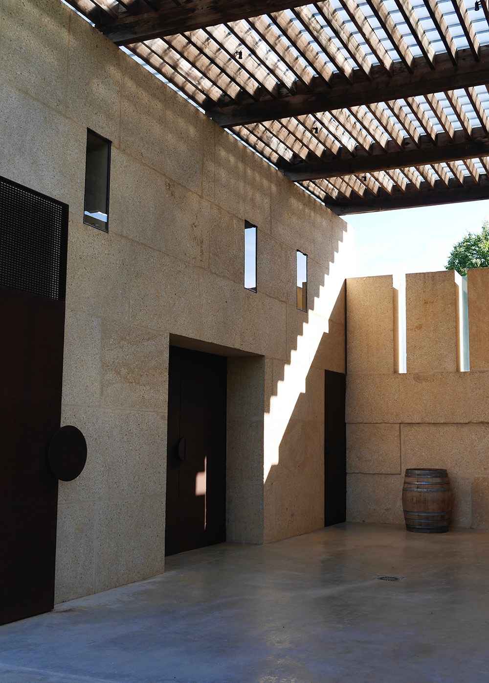 En 2001, le vigneron confie son projet à l’architecte Eric Castaldi puis à Gilles Perraudin, architectes. Ils choisissent la pierre comme matériau, peu coûteuse à l’époque : des blocs de 3 tonnes, de 1m35 à 1m40 de largeur, avec une épaisseur d’environ 65 cm.